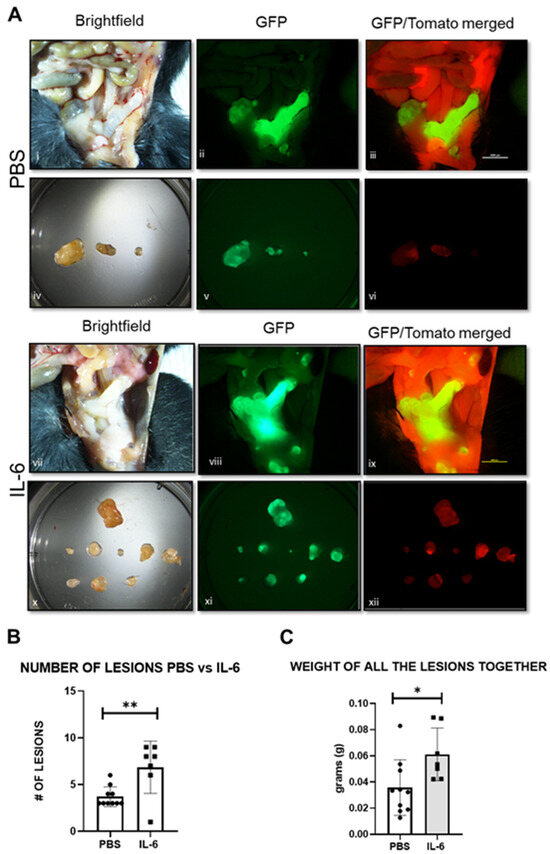Mouse lesions and uterus following PBS and IL-6 treatment: (A) Representative pictures in brightfield (i,iv,vii,x) and fluoresce GFP (ii,v,vii,xi) and GFP/Tomato merged (iii,vi,ix,xii). (B) Number of lesions in mice injected with PBS (n = 10) or IL-6 (n = 7). (C) Weight of all the lesions pooled together in animals injected with PBS or IL-6. * p < 0.05, ** p < 0.01.