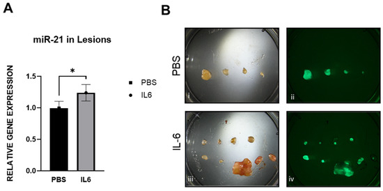 Comparison of miR-21 expression between mice injected with PBS and IL-6: (A) Expression of miR-21 in PBS (n = 4) compared with IL-6 treated mice (n = 3) (B) Representative pictures of lesions from PBS and IL-6 mice in brightfield (i,iii) and under fluorescence GFP (ii,iv). * p <0.05.
