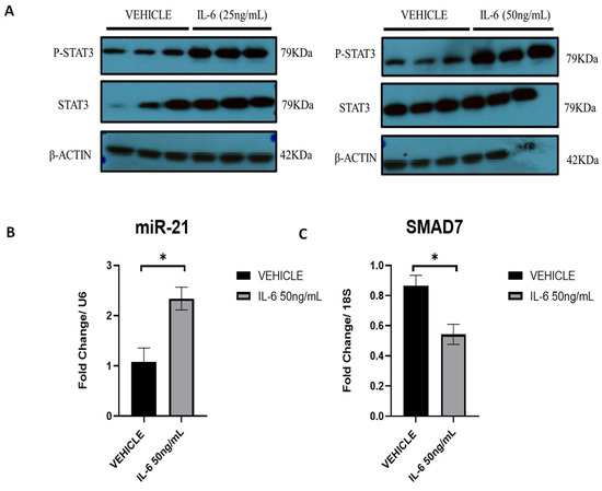 To confirm that interleukin-6 (IL-6) can activate STAT3 and subsequent phosphorylation in our cell lines, we first initiated a dose–response with 25 ng/mL and 50 ng/mL of IL-6 (Figure 11A). Both concentrations resulted in a positive response, but 50 ng/mL had a higher response. A time course experiment (12, 24 and 48 h) with 50 ng/mL was also performed. Following IL-6 stimulation at 50 ng/mL, miR-21 was initially increased (Figure 11B) at 12 h, and one of its targets, Smad 7, was significantly decreased.