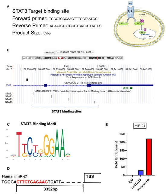 Predicted Transcription Factor binding sites for STAT3: (A) The primer used for the binding site. (B) The results from the transcription factor binding profile database JASPAR CORE 2022. The present study suggests that the expression of miR-21 is increased in ectopic stromal cells via p-STAT3 binding. (C,D) The predicted STAT3 binding site of human miR-21 promoter. (E) The binding efficiency of STAT3 on the human miR-21 promoter enhanced by IL-6 stimulation.