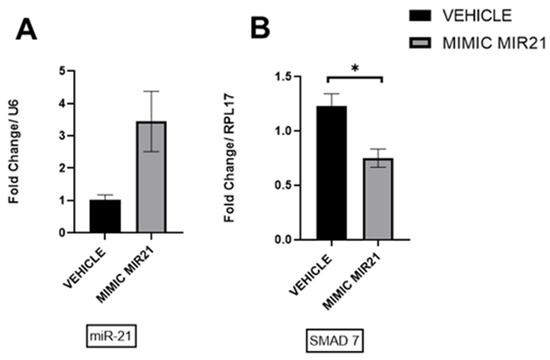 Overexpression of miR-21 in ectopic stromal cells: (A) Upregulation of miR-21 (B) was associated with the downregulation of Smad7 mRNA (n = 3). * p < 0.05.