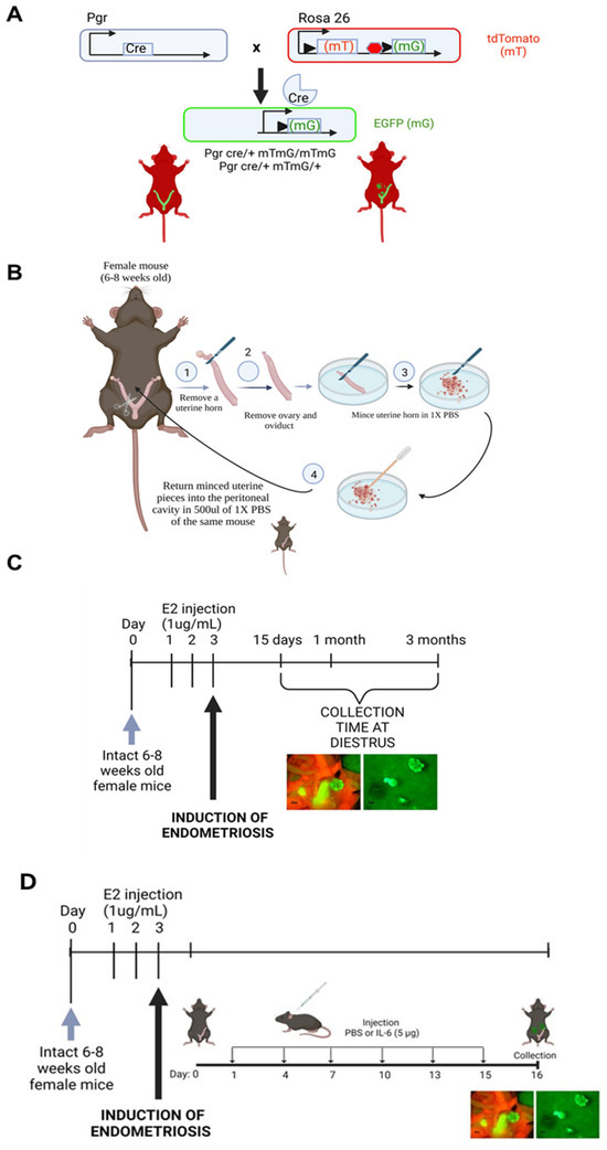 Mouse model used for the induction of endometriosis: (A) Schematic diagram of the mT/mG mouse construct before and after Cre-mediated recombination. (B) Diagram illustrating the surgical procedure for the induction of endometriosis using the double-fluorescent Cre reporter mouse. (C) Schematic diagram of the induction of endometriosis in the mT/mG mouse model of endometriosis. Lesions for the analysis were collected at 15 days, 1 month and 3 months post-induction during diestrus. (D) Experimental design of the mouse model of endometriosis and the days of injection of IL-6 or PBS after endometriosis induction. Created with BioRender.com.