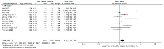 The published literature on the association between HNC and TL was thoroughly reviewed and meta-analyzed. The results suggest a statistically significant association between HNCs and TL (OR =1.38,CI 95% [1.10–1.73]). Specifically, patients with HNC had significantly shorter TL compared to controls.