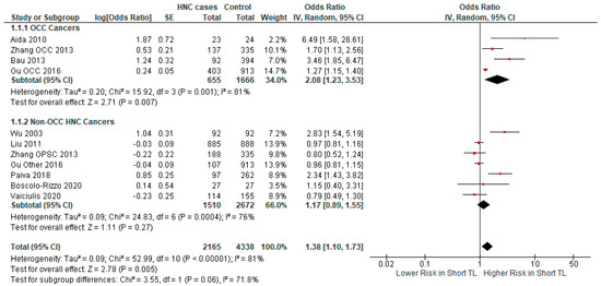 To further explore the relationship between TL and HNC, we performed a subgroup analysis using selected categories. We analyzed four studies with patients who exclusively had cancer of the oral cavity (Figure 3). In those particular studies, there was a significant association (p-value = 0.007) between short TL and OCC risk (OR = 2.08, CI 95% [1.23–3.53]). On the contrary, in the subgroup of studies with non-exclusively oral cavity cancer patients, the association between short TL and cancer risk (OR = 1.17, CI 95% [0.89–1.55]), was not statistically significant (p-value = 0.27).