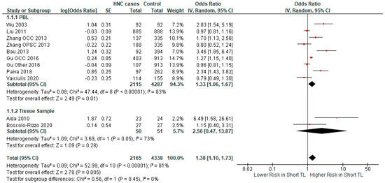 In studies in which the DNA source was PBL, a significant association (p-value = 0.01) between short TL and HNC risk was demonstrated (OR = 1.33 CI 95% [1.06–1.67]) (Figure 4). A non-significant association was found in the studies where tissue samples were used as the DNA source (OR = 2.56 CI 95% [0.47–13.87], p-value = 0.28).