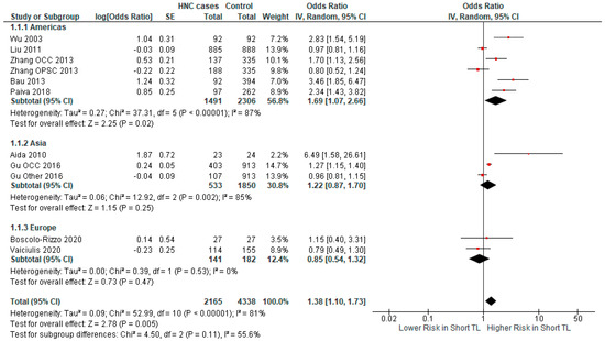 The results of a subgroup analysis conducted on the basis of the continent of origin found variations in the relationship between regions. The association of short TL and HNC was positive and significant in the American subgroup (OR 1.69 CI 95% [1.07–2.66], p-value = 0.02), positive but non-significant in the Asian subgroup (OR 1.22 CI 95% [0.87–1.70], p-value = 0.25), and negative and non-significant in Europe (OR 0.85 CI 95% [0.54–1.32], p-value = 0.47). The data were insufficient for a subgroup analysis of the basis of ethnic groups, thereby the results may be interpreted as either a consequence of cultural or genetic factors, as TL has been associated with both racial and lifestyle/cultural factors [49,50]. Another possible interpretation could be a positive association independent of region. This assumption is based on a positive association being found in all studies in the Asian and European subgroups—excluding those that did not contain any oral cancers.