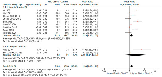 We examined the impact of sample size on the relationship between short TL and HNC risk (Figure 7). We found no significant association in studies with a sample size < 100 (OR = 2.56 CI 95% [0.47–13.87], p-value = 0.28), while the association was significant in studies with a sample size > 100 (OR = 1.33 CI 95% [1.06–1.67], p-value = 0.01).