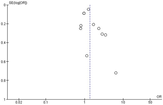 To assess the meta-analysis for publication bias, we created a Funnel Plot (Figure 8). The Funnel Plot, following visual inspection, indicates no publication bias among the larger studies. Among the smaller studies, the Funnel Plot shows some asymmetry, which could be evidence of publication bias. We performed a sensitivity analysis by calculating the summary OR while successively removing each study. We found that the significance of the overall result did not change by the removal of any one study (Table S1). The analysis was performed by two independent authors and any conflicts were resolved by consensus.