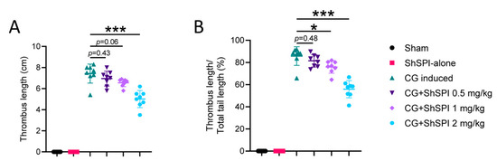 ShSPI inhibited thrombus formation in vivo. (A) CG-induced thrombosis in mouse tails was significantly inhibited by ShSPI treatment after 24 h. (B) Percentage of thrombus length was also significantly attenuated with ShSPI treatment in a dose-dependent manner. Data are mean ± SD, and compared using one-way analysis of variance followed by Dunnett’s multiple comparisons tests, with group CG induced as control. N = 6 in group Sham and group ShSPI, N = 8 in another four groups, points represent individual mice. CG: carrageenan, * p < 0.05, *** p < 0.001.