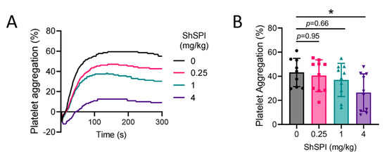 ShSPI inhibits platelet aggregation in a dose-dependent manner. (A) Representative images of platelet aggregation of mouse platelet-rich plasma induced by ADP after ShSPI treatment at concentrations of 0-4 mg/kg. (B) Statistical analysis of platelet aggregation after ShSPI treatment at concentrations of 0-4 mg/kg. Data are shown as mean ± SD, and compared using one-way analysis of variance followed by Dunnett’s multiple comparisons tests, with ShSPI-0 mg/kg as control, N = 10, and each point represents data from one mouse. * p < 0.05.