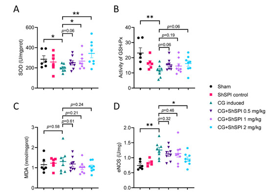 ShSPI modulates oxidative stress. (A) ShSPI treatment reversed the CG-induced reduction in SOD activity. (B) ShSPI did not significantly inhibit CG-induced decrease in GSH-PX activity. (C) CG showed no impact on MDA levels, and ShSPI treatment also showed no effect on MDA. (D) ShSPI significantly and dose-dependently abolished the CG-induced increase in eNOS activity. Data are shown as mean ± SD, and compared using one-way analysis of variance followed by Dunnett’s multiple comparisons tests, with group CG induced as control. N = 6 in group Sham and group ShSPI, N = 8 in another four groups, points represent individual mice. CG: carrageenan, SOD: superoxide dismutase, GSH-PX: glutathione peroxidase, MDA: maleicdialdehyde, eNOS: endothelial nitric oxide synthase, * p < 0.05, ** p < 0.01.