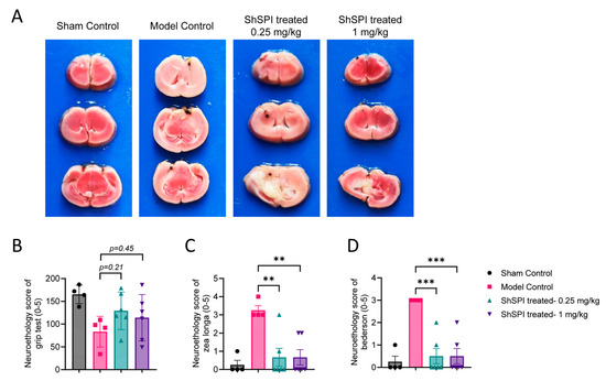 Elastase inhibitors have been widely recognized for their protective effects against IS [2,10,13]. To evaluate the efficacy of ShSPI in this context, we employed a tMCAO mouse model. As shown in Figure 5A, ShSPI treatment at doses of 0.25 and 1 mg/kg results in a significant, dose-dependent reduction in infarct volumes. Furthermore, this reduction in infarct size correlated with notable improvements in functional outcomes, as evidenced by enhanced performance in the Grip test (Figure 5B), Zea Longa score (Figure 5C), and Bederson score (Figure 5D). These findings collectively indicate that ShSPI offers substantial neuroprotection against IS.