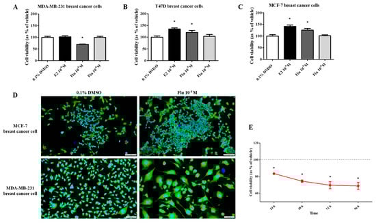 Effect of cell viability by applying the WST assay and DAPI and actin staining after treatment with fludioxonil in MDA-MB-231, T-47D, and MCF-7 breast cancer cells. The cell viability assay was conducted after treatment with fludioxonil for 72 h in (A) MDA-MB-231, (B) T-47D, and (C) MCF-7 breast cancer cells. (D) The image presents the difference in cell viability by treatment with fludioxonil for 72 h in MCF-7 and MDA-MB-231 breast cancer cells. (E) The cell viability of MDA-MB-231 breast cancer cells by treatment with fludioxonil was changed in a time-dependent manner. Flu: fludioxonil; E2: 17β-estradiol. DMSO was used as the vehicle control, and the value of the control containing 0.1% DMSO was set as 100%. Data in the graphs are obtained from at least three repeated experiments and are presented as the mean ± SEM. Statistical analysis was determined by (A–C) one-way ANOVA followed by Dunnett’s multiple comparison and (E) two-way ANOVA followed by the Bonferroni posttests using the GraphPad Prism 5.01 software. p < 0.05 was considered statistically significant. *: p < 0.05 compared to control. Scale bar = 100 μm or 200 pixels.