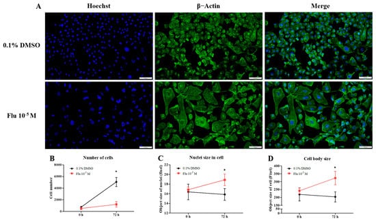 To confirm the changes to the cell morphology in detail, the cells were stained using ActinGreen and the Hoechst dye (Figure 2A). The cell morphology of the MDA-MB-231 cells was changed to a hetero-, enlarged, and multinucleated shape. The cell number after fludioxonil (10−5 M) treatment for 72 h did not significantly increase compared to the control (Figure 2B). In contrast, the average size of the nuclei (Figure 2C) and the cell body size (Figure 2D) increased significantly, 1.12 and 1.33 times, respectively, compared with the control. These findings indicate that the viability of the cells after treatment with fludioxonil was similar to that with E2 in ER-expressing breast cell lines, but fludioxonil induced morphological changes without increasing cell viability in the MDA-MB-231 breast cancer cells.
