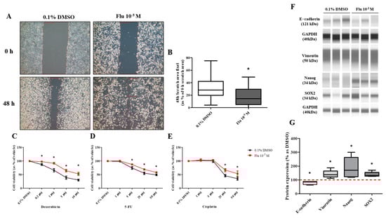 Effects of cell migration ability and chemo-resistance by applying the scratch assay and WST assay after treatment with 0.1% DMSO or fludioxonil in MDA-MB-231 breast cancer cells. (A) Cells were incubated for 2 days after seeding and scratched using a 1000 μL tip. After washing twice, the cells were treated by 0.1% DMSO or fludioxonil in the media for 48 h. (B) The value was presented in the graph. Cells were incubated for 2 days after seeding and treated each with (C) doxorubicin, (D) 5-FU, and (E) cisplatin for 72 h to confirm the chemo-resistance. (F,G) The changes of epithelial marker-related proteins were analyzed using Jess from Protein Simple. Flu: fludioxonil, DMSO was used as the vehicle control, and the value of the control containing 0.1% DMSO was set as 100%. Data in the graphs are obtained from at least three repeated experiments and are presented as the mean ± SEM. Data in the graphs are obtained from at least three repeated experiments and are presented as the mean ± SEM. Statistical analysis was determined by (B) one-way ANOVA followed by Dunnett’s multiple comparison, (C–E) two-way ANOVA followed by Bonferroni posttests, and (G) t-test (paired test) using the GraphPad Prism 5.01 software. p < 0.05 was considered statistically significant. *: p < 0.05 compared to control. Scale bar = 200 μm.