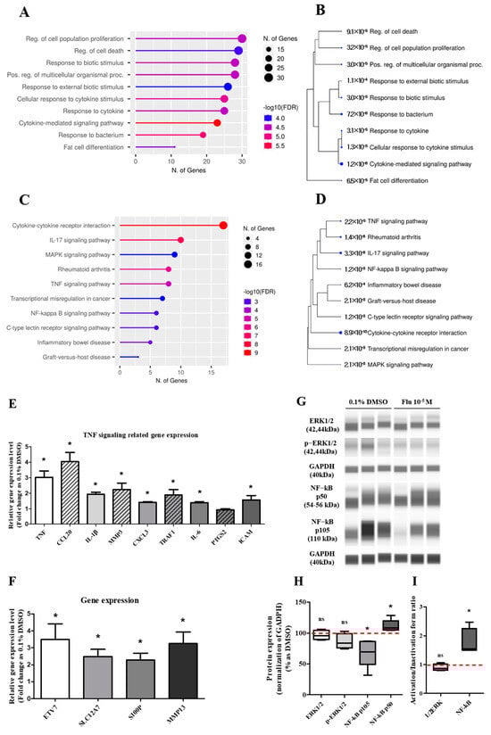 Gene Ontology enrichment analysis of DEGs and qPCR of related genes, and the expression change of TNF pathway-related proteins after treatment with 0.1% DMSO or fludioxonil in MDA-MB-231 breast cancer cells. The DEGs treated with 0.1% DMSO or fludioxonil were analyzed for enrichment in three ontologies: (A,B) GO biological process and (C,D) KEGG pathway using Shiny GO 0.77. (E) The change in TNF signaling-related gene expression was confirmed using real-time PCR. (F) Based on the results of DEGs, the cancer-related gene with a high expression of fold change was confirmed using real-time PCR. (G,H) The change in major pathway-related proteins expression was confirmed using Jess from Protein Simple. (I) The activity of 1/2ERK and NF-κB was separately graphed as the ratio of inactivation form to active form. Flu: fludioxonil, DMSO was used as the vehicle control, and the value of the control containing 0.1% DMSO was set as 100%. Data in the graphs are obtained from at least three repeated experiments and are presented as the mean ± SEM. Statistical analysis was determined by (E,F) t-test (paired test) using the GraphPad Prism 5.01 software. p < 0.05 was considered statistically significant. *: p < 0.05 compared to control.