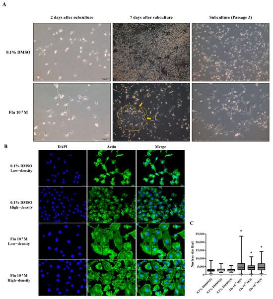 The acquisition process and morphology changes of daughter cells after treatment with 0.1% DMSO or fludioxonil in MDA-MB-231 breast cancer cells. (A) The daughter cells were passage-3 cells after being exposed to 0.1% DMSO or fludioxonil for 72 h. The cells were subcultured 1.0 × 105 cells/dish and incubated for 7 days. This process was repeated twice. The yellow line is borderline of small colony that newly formed after treatment of fludioxonil for 72h. (B) The images of daughter cells were of morphology following different cell densities. (C) The graph was present the difference of nuclear size after subculturing three times following exposure of 0.1% DMSO or fludioxonil. Flu: fludioxonil, DMSO was used as the vehicle control, and the value of the control containing 0.1% DMSO was set as 100%. Data in the graphs are obtained from at least three repeated experiments and are presented as the mean ± SEM. Statistical analysis was determined by (C) one-way ANOVA followed by Dunnett’s multiple comparison using the GraphPad Prism 5.01 software. p < 0.05 was considered statistically significant. *: p < 0.05 compared to control. Upper image scale bar = 200 μm, lower image scale bar = 50 μm.