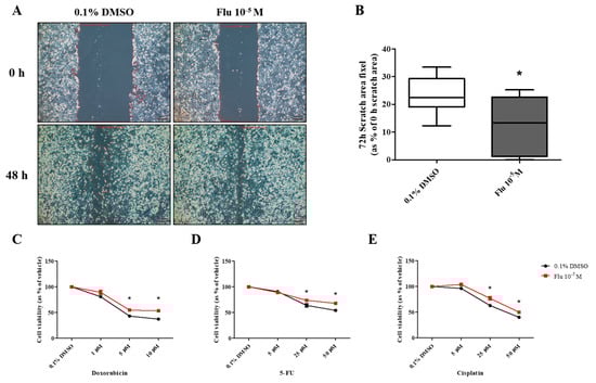 Effects of cell migration ability and chemo-resistance by applying the scratch assay and WST assay on daughter cells of MDA-MB-231 breast cancer cells after treatment with 0.1% DMSO or fludioxonil for 72 h. (A) Cells were incubated for 2 days after seeding and scratched using a 1000 μL tip. After washing twice, the cells were incubated for 48 h, (B) and the value was presented in the graph. To establish the chemo-resistance, cells were incubated for 2 days after seeding and treated each with (C) doxorubicin, (D) 5-FU, and (E) cisplatin for 72 h. Flu: fludioxonil, DMSO was used as the vehicle control, and the value of the control containing 0.1% DMSO was set as 100%. Data in the graphs are obtained from at least three repeated experiments and are presented as the mean ± SEM. Statistical analysis was determined by (B) one-way ANOVA followed by Dunnett’s multiple comparison and (C–E) two-way ANOVA followed by Bonferroni posttests using the GraphPad Prism 5.01 software. p < 0.05 was considered statistically significant. *: p < 0.05 compared to control. Scale bar = 50 μm or 100 pixels.