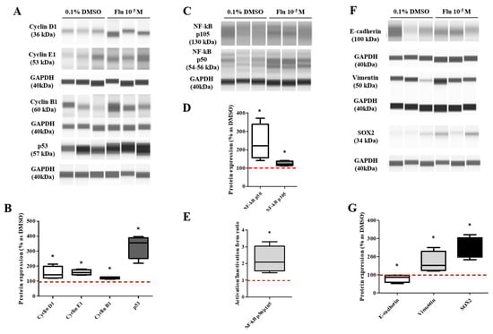 Effects of protein expression on daughter cells of MDA-MB-231 breast cancer cells. These cells were analyzed for protein expressions such as cell cycle-related (A,B), NF-κB-related (C–E), EMT-related and stemness-related proteins (F,G). Flu: fludioxonil, DMSO was used as the vehicle control, and the value of the control containing 0.1% DMSO was set as 100%. Data in the graphs are obtained from at least three repeated experiments and are presented as the mean ± SEM. Statistical analysis was determined by (B–G) t-test (paired test) compare with 0.1% DMSO using the GraphPad Prism 5.01 software. p < 0.05 was considered statistically significant. *: p < 0.05 compared to control.