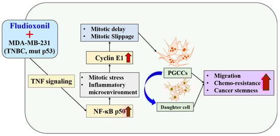 Fludioxonil induced the transformation process to PGCCs on p53mut MDA-MB-231 breast cancer cells via TNF with NF-κB signaling. Fludioxonil caused accumulation of the Cyclin E1 and promotion of the inflammatory cytokine-enriched microenvironment via up-regulation of TNF and NF-κB, and it led to the transformation to PGCCs via mitotic delay and mitotic slippage in mut p53mut TNBC MDA-MB-231 cells. PGCCs and their daughter cells had outstanding migration ability, chemo-resistance, and cancer stemness (red arrow: increasing of expression or ability, blue arrow: production of daughter cell in PGCCs).