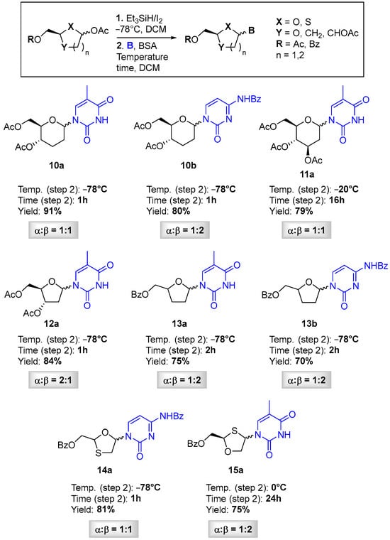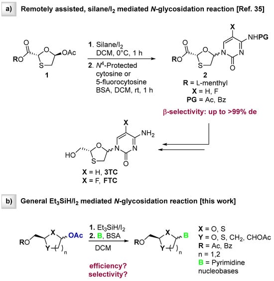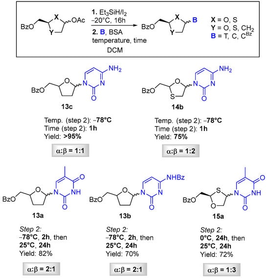 - Choi, W.B.; Wilson, L.J.; Yeola, S.; Liotta, D.C.; Schinazi, R.F. In Situ Complexation Directs the Stereochemistry of N-Glycosylation in the Synthesis of Thialanyl and Dioxolanyl Nucleoside Analogs. J. Am. Chem. Soc. 1991, 113, 9377–9379. [Google Scholar] [CrossRef]