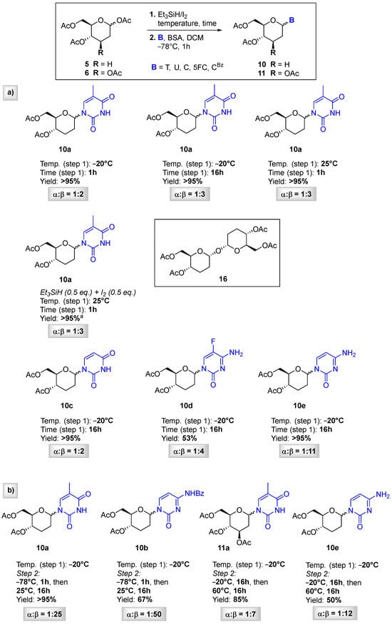 - The formation of β-glycosyl iodide intermediates has been postulated to be formed at −5/0 °C or at lower temperatures, see: Davis, R.A.; Lin, C.-H.; Gervay-Hague, J. Chemoenzymatic Synthesis of Cholesteryl-6-O-Tetradecanoyl-α-d-Glucopyranoside: A Product of Host Cholesterol Efflux Promoted by Helicobacter Pylori. Chem. Commun. 2012, 48, 9083–9085. [Google Scholar] [CrossRef] [PubMed]