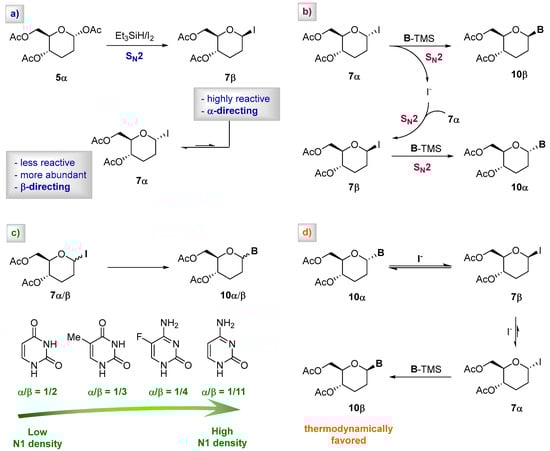- Reaction efficiency was indeed affected by the addition order of the reagents. if I2 was added soon after Et3SiH during glycosyl iodide formation, a considerable amount (50%) of pyran 9 was detected after subsequent nucleobase addition.
