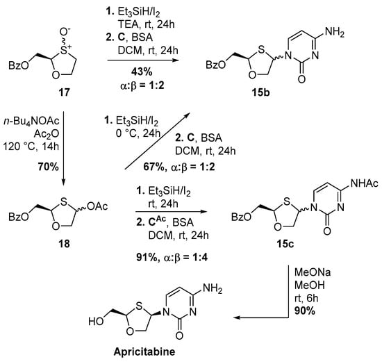 - Caso, M.F.; D’Alonzo, D.; D’Errico, S.; Palumbo, G.; Guaragna, A. Highly Stereoselective Synthesis of Lamivudine (3TC) and Emtricitabine (FTC) by a Novel N -Glycosidation Procedure. Org. Lett. 2015, 17, 2626–2629. [Google Scholar] [CrossRef] [PubMed]
