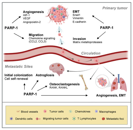 The development of metastasis is a multistep process during which cancer cells undergo a cascade of events including primary tumor formation, localized invasion, angiogenesis and intravasation, transport through the circulation, arrest in microvessels of various organs, extravasation, formation of micrometastasis, and colonization with formation of macrometastasis distant sites [64,65]. The role of PARP-1 in the metastatic process is summarized in Figure 1.