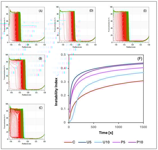 Effects of sequential thermal and non-thermal induction on the transmission profiles “fingerprints” (A–E) and the destabilization kinetics (F) of the obtained hydrogels (n = 3). Samples description: (A) control hydrogel C induced via thermal induction; (B,C) thermal induction followed by ultrasound treatment for 5 and 10 min, U5 and U10, respectively; (D,E) thermal induction followed by high hydrostatic pressure treatment for 5 and 10 min, P5 and P10, respectively. For (A–E), the red lines represent light extinction at the starting point, and the green lines represent light extinction at the end of the analysis.