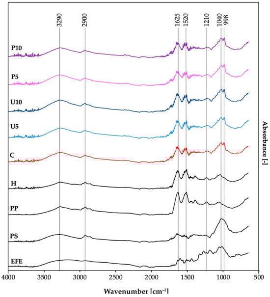 FT-IR spectra for the building blocks (EFE, PP, and PS) and the obtained hydrogels (H, C, U5, U10, P5, and P10). Samples description: EFE—Elderberry fruit extract; PS—Psyllium; PP—Pea protein; H—Pea protein–psyllium hydrogel without elderberry fruit extract; C—Control hydrogel induced via thermal induction; U5 and U10—Thermal induction followed by ultrasound treatment for 5 and 10 min, respectively; P5 and P10—Thermal induction followed by high hydrostatic pressure treatment for 5 and 10 min, respectively.