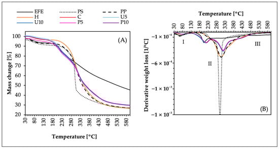 Phases of the thermal degradation analysis of the building blocks (EFE, PP, and PS) and the obtained hydrogels (H, C, U5, U10, P5, and P10). (A) Thermogravimetric analysis (TGA) and (B) derivative thermogravimetry (DTG). Samples description: EFE—Elderberry fruit extract; PS—Psyllium; PP—Pea protein; H—Pea protein–psyllium hydrogel without elderberry fruit extract; C—Control hydrogel induced via thermal induction; U5 and U10—Thermal induction followed by ultrasound treatment for 5 and 10 min, respectively; P5 and P10—Thermal induction followed by high hydrostatic pressure treatment for 5 and 10 min, respectively.