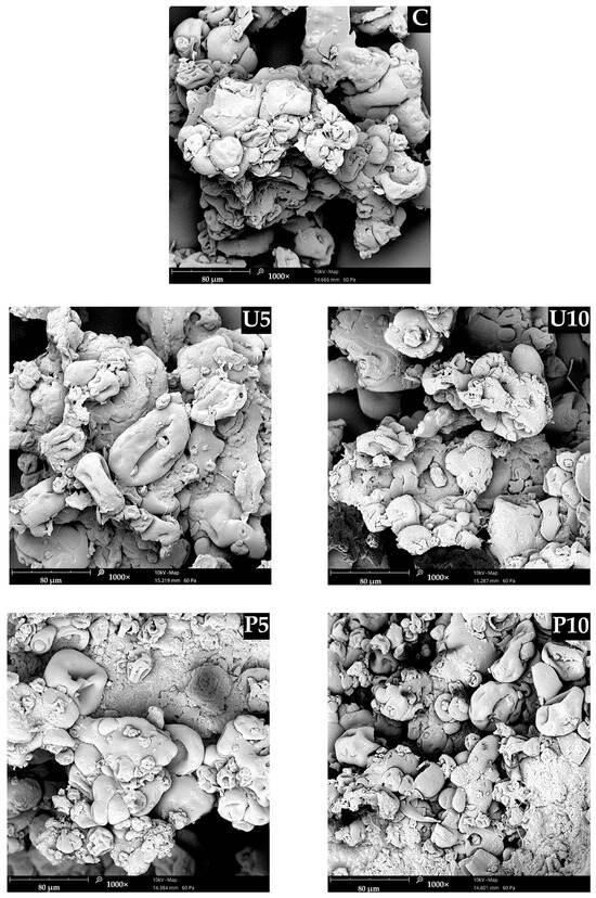 Sequential thermal, ultrasound (U5, U10), and high hydrostatic pressure (P5, P10) induction did not significantly alter the FT-IR spectra. These findings suggest that ultrasound (US) and high hydrostatic pressure (HHP) affect the overall morphology—such as pore size, density, and homogeneity—without significantly modifying the chemical bonds within the hydrogel matrix. This observation aligns with the study by Jambrak et al. [], where ultrasound treatment on soy protein isolate revealed minimal changes in chemical composition based on FT-IR spectra. However, alterations in protein aggregation behavior were noted, indicating changes in protein interactions without affecting individual amino acid bonds. Similarly, ultrasonic treatment of chitosan exhibited no significant changes in characteristic peaks, suggesting the primary chemical structure remained intact while changes in crystallinity were observed []. Conversely, some studies report that US treatment can alter the conformation and chemical interactions of biopolymers due to cavitation-induced temperature increases, leading to protein denaturation and degradation of thermolabile components []. In our study, US treatment was performed in an ice bath to mitigate overheating, and the absence of changes in FT-IR spectra may be attributed to the pre-denatured state of pea proteins from prior thermal induction. In the case of HHP treatment, previous studies on soy protein and flaxseed gum indicated a decrease in glycation sites and alterations in protein secondary structure []. Jin et al. [] demonstrated that HHP could induce morphological changes in soy protein hydrolysates/β-glucan/ferulic acid complexes, transforming them from primarily spherical to irregular shapes, influenced predominantly by binding interactions among the components. Moreover, HHP has been shown to significantly modify molecular weight distribution, average particle size, and morphological arrangement or orientation of various polysaccharides [].