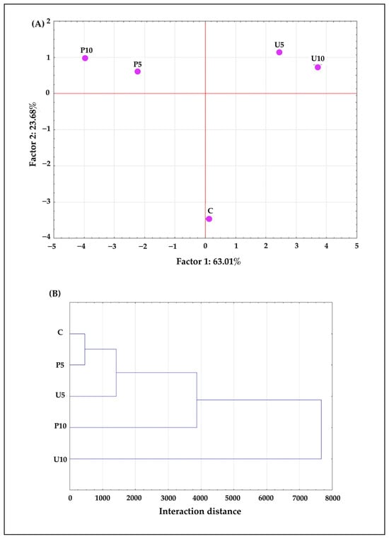 Principal component analysis (PCA) and hierarchical cluster analysis (HCA) were applied to the obtained results to efficiently summarize the data collected in this study. PCA was performed using 16 active variables. Two principal components were identified (Figure 5A): component 1 (Factor 1) accounted for 63.01% of the variance, and component 2 (Factor 2) accounted for 23.68% of the variance. Together, these components explained 86.7% of the total variance in the results. Component 1 is strongly positively correlated with chroma C* (r = 0.96). On the other hand, a negative contribution of this factor was found for spreadability (r = −0.97), strength (r = −0.95), EE (r = −0.91), TPC (r= −0.88), ABTS (r = −0.98), DPPH (r = −0.74), and RP (r = −0.64). Component 2 is positively correlated with the SLB (r = 0.91) and instability index (r = 0.91). The negative contribution of factor 2 can be observed for EI (r = −0.89) and adhesion (r = −0.86). Given these interdependencies, the first principal component can be interpreted as a measure of the induction method that can attribute to the entrapment of elderberry extract and, consequently, the overall antioxidant activity. The second component can be interpreted as a measure of the induction method, contributing to the overall physical stability of the formed gel structure. Based on the sample distribution within the principal component space (Figure 5A) and the interaction distances observed in HCA (Figure 5B), it can be concluded that sequential thermal, ultrasound, and high hydrostatic pressure induction result in hydrogels with significantly different properties. The sequential thermal and ultrasound induction resulted in hydrogels with low structural stability and elasticity, negatively affecting the entrapment efficiency of the elderberry extract and the final antioxidant activity. Furthermore, extending the treatment time to 10 min (U10) may have caused additional degradation of the polyphenols, explaining the highest observed interaction distance (Figure 5B). On the other hand, the sequential thermal and high hydrostatic pressure induction resulted in hydrogels with high entrapment efficiency due to the formation of a compact gel structure capable of entrapping the extract. However, this structural compression also led to high SLB values. Nonetheless, these systems exhibited high antioxidant activity, with 10 min of HHP treatment yielding the highest total polyphenol content and antioxidant activity.