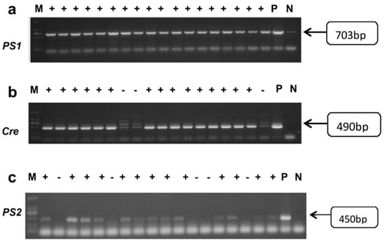 Graphs of agarose gel electrophoresis results of DNA PCR products from DKO offspring mice. (a) PS1 gene results, band position 703 bp. (b) Cre gene results, band position 490 bp. (c) PS2 gene result map, band position 450 bp. M: DNA Marker; P: Positive control; N: Negative control.