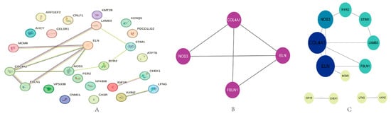 A preliminary PPI network was established based on 25 candidate genes. There are 25 nodes and 12 edges in Figure 3, with a local clustering coefficient of 0.28 (Figure 3A). MCODE was used to identify highly interconnected subnetworks, and the MCODE network analysis reveals one cluster containing four nodes (COL4A1, ELN, NOS3, and FBLN1) and five edges (Figure 3B). Four proteins in the subnetwork are COL4A1, ELN, NOS3, and FBLN1. Data for the subnetworks are shown in Table S4. To include more proteins for the study, we included the original proteins based on the subnetwork for further analysis, though the cytoHubba was used to assess the importance of the nodes in the network, quantitatively ranking the hub genes. The size of the node represents the degree value of the target; the larger the node, the greater the degree value. Nodes represent proteins and edges represent interaction relationships between proteins. Proteins with large degrees play a crucial role in the whole network. The top five proteins with degree intelligence are COL4A1, ELN, NOS3, FBLN1, and LAMB3 (Figure 3C).