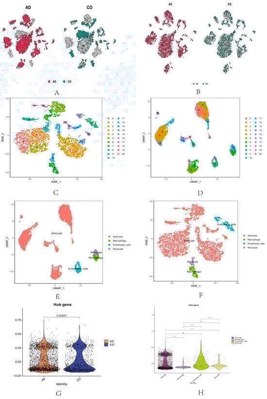 Discovery of quality control and cellular annotations in scRNA-seq data. (A) Cellular distribution of unfiltered AD and CO. (B) Cellular distribution of filtered AD and CO. (C) Cell clustering classification under the T-SNE algorithm. (D) Cell-clustering classification under the UAMP algorithm. (E) Cellular annotations under the T-SNE algorithm. (F) Cellular annotations under the UAMP algorithm. (G) Expression of hub genes in the AD and control group. (H) Expression of hub genes in cellular annotations. (ns: p > 0.05; *** p <0.001, **** p < 0.0001).