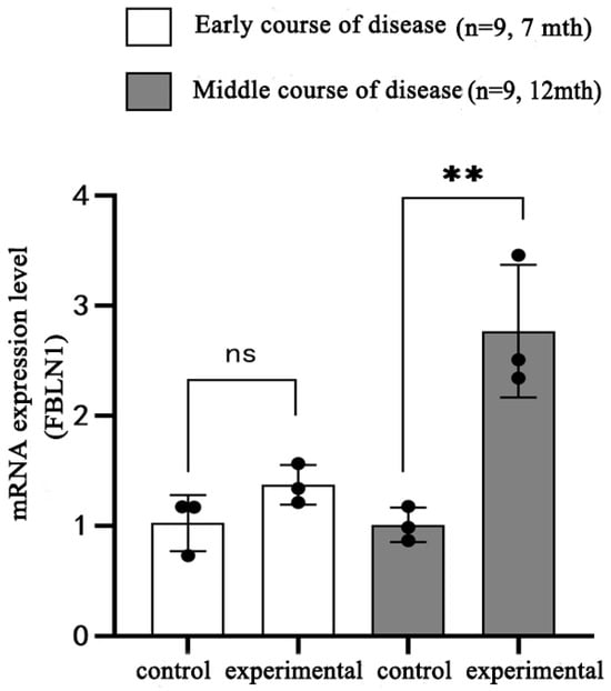 mRNA expression of FBLN1 gene in hippocampal tissue of DKO mice with early and intermediate AD disease (ns: p > 0.05; ** p < 0.01).