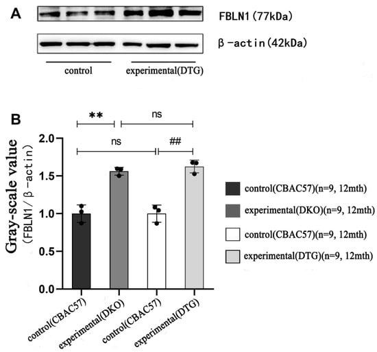 In the mid-stage of AD progression, the protein expression of the FBLN1 gene in the hippocampal tissue of 12-month-old female DKO mice was significantly higher than that in same-age and same-sex CBAC57 mice, with a statistically significant difference (p < 0.01), as shown in Figure 8B and Table S7. Additionally, the protein expression of the FBLN1 gene in the hippocampal tissue of 12-month-old female DTG mice was significantly elevated compared to same-age and same-sex CBAC57 mice (p < 0.01), as shown in Figure 9A and Table S7.