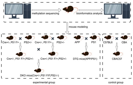 Therefore, to more accurately model the pathophysiological progression of human AD and obtain precise experimental results and conclusions, this study utilizes both DKO and DTG mouse models. DKO mice exhibit significant age-dependent neurodegenerative changes, while the DTG mice compensate for the lack of Aβ deposition and senile plaque formation in the DKO model, thus encompassing key pathological features of AD. With the advent and application of high-throughput sequencing technologies, Reduced Representation Bisulfite Sequencing (RRBS) has become widely used for DNA methylation detection due to its accuracy, efficiency, and cost-effectiveness []. Additionally, the rapid advancement of bioinformatics over the past decade has enabled comprehensive analyses of gene variations and co-expression, providing valuable insights into how these factors influence protein function and disease progression. Techniques such as molecular biology-enrichment analysis, based on molecular functions, biological processes, and cellular components, have become indispensable tools for further research.