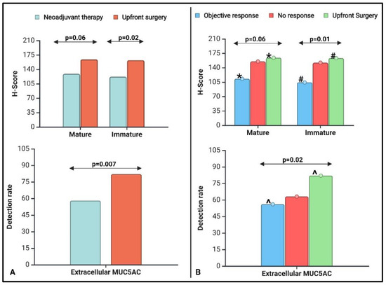 Comparison of MUC5AC glycoforms (mean H-scores) among the tested groups, (A) neoadjuvant therapy group vs. upfront surgery (UpS) and (B) objective response (OR) vs. no-response vs. UpS; * OR vs. UpS—p = 0.04; # OR vs. UpS—p = 0.01; ^ OR vs. UpS—p = 0.01.
