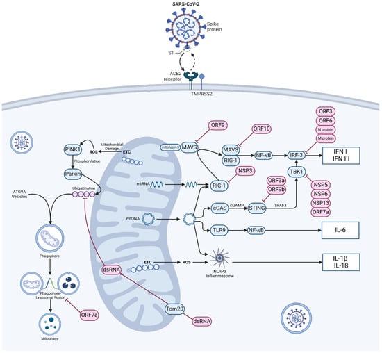 Mechanism of SARS-CoV-2 entry, mitochondrial damage sensing and innate immune dysregulation. Viral particles enter cells via the angiotensin-converting enzyme 2 (ACE2) receptor and TMPRSS2 protease. In normally functioning cells various mechanisms exist to warn of mitochondrial damage and viral infection, most notably via retinoic acid inducible gene-1 and mitochondrial antivirus signalling protein (RIG-1-MAVS), cyclic GMP–AMP synthase and stimulator of interferon genes (cGAS-STING) signalling, Toll-like receptor-9 (TLR9) and activation of the NOD-, LRR -and pyrin domain containing protein 3 (NLRP3) inflammasome. Damage to mitochondria resulting in the production of ROS initiates mitophagy via the PTEN-induced kinase 1 (PINK1)-Parkin E3 ubiquitin ligase pathway. Infection of cells by SARS-CoV-2 disrupts these axes at a number of control points and causes widespread aberration to systems of innate immunity. Abbreviations: ACE2—angiotensin-converting enzyme 2; ATG9A—autophagy-related protein 9A; cGAMP—cyclic GMP-AMP; cGAS—cyclic GMP-AMP synthase; dsRNA—double-stranded RNA; ETC—electron transport chain; IL-1β—interleukin 1 beta; IL18—interleukin 18; IL-6—interleukin 6; IFN I—type I interferon; IFN III—type III interferon; MAVS—mitochondrial antiviral-signalling protein; NFκB—nuclear factor kappa-light-chain-enhancer of activated B cells; NSP—non-structural protein, ORF—open reading frame; Parkin—E3 ubiquitin-protein ligase parkin; ROS—reactive oxygen species; STING—stimulator of interferon genes; TBK1—TANK-biding kinase 1; TMPRSS2—transmembrane protease, Serine 2; TLR9—Toll-like receptor 9; Tom20—translocase of outer mitochondrial membrane 20; TRAF3—TNF receptor-associated factor 3; mtDNA—mitochondrial DNA. Pink objects indicate material of viral origin, blue objects indicate self-material. (Created with BioRender.com).