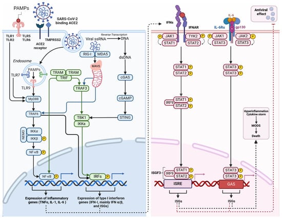 Inflammation triggered by macrophage after SARS-CoV-2 infection. Activation of Toll-like receptors (TLRs) occurs when they recognise pathogen-associated molecular patterns (PAMPs). These patterns are typically found in foreign organisms, such as bacteria and viruses. TLR localisation can occur on either the cell surface (TLR-1, -2, -4, -5, -6, -10) or in intracellular compartments such as endosomes (TLR-3, -7, -8, -9). The ability to recognise viral single-stranded RNA (ssRNA) implies its potential for SARS-CoV-2 clearance of SARS-CoV-2. These receptors detect signals and initiate NF-κB and IRF activation. Activation can occur through the MyD88-dependent and MyD88-independent pathways, ultimately leading to the expression of cytokines and interferon (IFN-I). The binding of viral RNA to RIG-I or MDA5 prompts the creation of MAVS polymers in mitochondria, followed by the subsequent attachment of TRAFs. TRAFs activate the NF-κB, and interferon regulatory factors (IRFs), mainly IRF-3 and IRF-7. This process leads to the expression of antiviral interferon-stimulated genes (ISGs) and pro-inflammatory cytokines. Cytosolic DNA sensors, primarily cGAS detect viral DNA, including dsDNA from DNA viruses or reverse-transcribed DNA from retroviruses. Upon binding to dsDNA, cGAS becomes activated and catalyses the production of a second messenger cyclic GMP-AMP (cGAMP). cGAMP binds and activates STING, which recruits and activates TBK1. Activated TBK1 phosphorylates the transcription factor IRF3 leading to the expression of ISGs. Activation of the JAK-STAT pathway by IFN and cytokines initiates the innate immune response against viral infections. The role of this pathway is critical in various physiological and pathological processes like cancer development, inflammation, tissue damage, and viral infections. The binding of Type I IFN to IFNα receptors (IFNAR) activates JAKs, which in turn phosphorylates and moves STATs to the nucleus. This process leads to the expression of antiviral ISGs. Once the STAT1-STAT2 heterodimer is formed, it binds to IRF9 to create the transcriptionally active ISGF3. The early immune response to viral infections heavily relies on the activation of the Jak2/STAT3 signalling pathway by Il-6, which facilitates virus clearance through neutrophils. The IL-6 protein binds to the IL-6R receptor, which is composed of the IL-6α receptor molecule and the gp130 signal transducer, allowing cell signalling. JAK2 activation induced by IL-6 through gp130 results in the activation of STATs, particularly STAT3. Abbreviations: ISGs—interferon-stimulated genes; cGAMP—cyclic GMP-AMP; cGAS—(cyclic GMP-AMP synthase); GAS—interferon-activated site; IFNs—interferons; IKKα—IκB kinase α; IRF9—interferon regulatory factor 9; ISGF3—INF-stimulated gene factor 3; ISGs—interferon-stimulated genes; ISRE—interferon-stimulated response element; JAK—Janus kinase; MDA5—melanoma differentiation-associated protein 5; MODS—multiple organ dysfunction syndrome; MyD88—myeloid differentiation primary response 88; NEMO—NF-κB essential modulator; PAMPs—pathogen-associated molecular patterns; RIG-I—retinoic acid-inducible gene I; STAT—signal transducer and activator of transcription; STING—stimulator of interferon genes; TBK1—TANK-binding kinase; TRAF—tumour necrosis factor receptor-related factor; TRAF6—tumour necrosis factor receptor-related factor 6; TRAM—trif-related adaptor molecule; TRIF—domain-containing adaptor protein inducing interferon β; Tyk2—tyrosine kinase 2. Different colours in the figure represent various components of the signaling pathways–blueindicates MyD88-dependent and cGAS-STING pathways, green represents IRF, and pink represents the JAK/STAT pathway. c. (Created with BioRender.com).