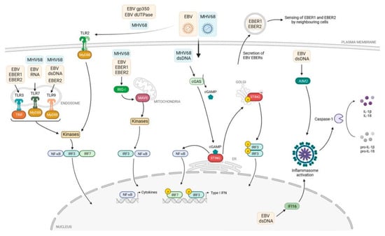 - Gaglia, M.M. Anti-viral and pro-inflammatory functions of Toll-like receptors during gamma-herpesvirus infections. Virol. J. 2021, 18, 218. [Google Scholar] [PubMed]