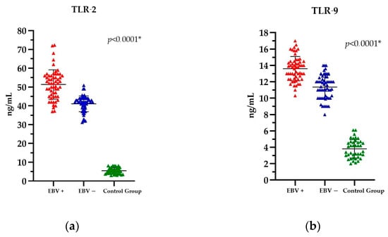 Chicago/Turabian StyleSikora, Dominika, Jacek Kiś, Ewa Stępień, Bartłomiej Drop, and Małgorzata Polz-Dacewicz. 2024. "Serum TLR2 and TLR9 in Prostate Cancer Patients in Relation to EBV Status" International Journal of Molecular Sciences 25, no. 16: 9053. https://doi.org/10.3390/ijms25169053