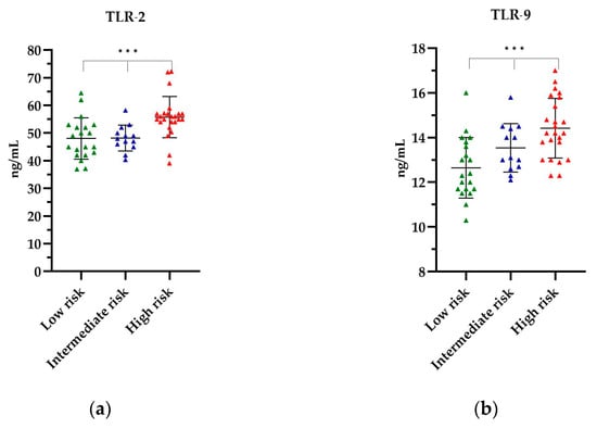2.3. Evaluation of the Level of TLR-2 and TLR-9 in EBV-Positive PCa Patients in Relation to Risk Group
