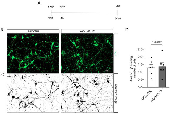 To assess whether the overexpression of miR-17 had an influence on neurite outgrowth, we transduced rat primary cortical neurons with either AAV.miR-17 or AAV.CTRL and 8 days later, we fixed the cells and stained the neuronal cell bodies and neurites with an antibody against β-III-tubulin (Tuj1) (Figure 2A,B). Then, we imaged the cortical neurons in a fluorescent microscope, quantified the area occupied by the Tuj1 staining, and normalized by the number of neurons in each image. No significant differences were detectable in the area of the Tuj1 staining after transduction with AAV.miR-17 (1.4 ± 0.25) compared with AAV.CTRL (1.3 ± 0.21) (Figure 2C,D).