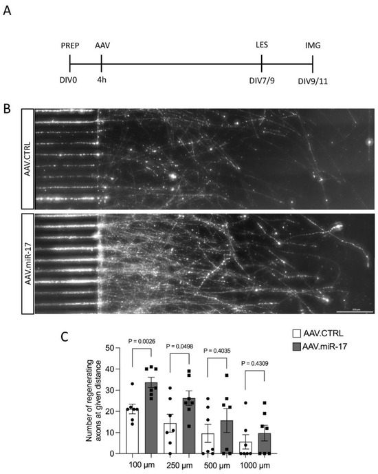 Having found increased neurite regeneration by AAV.miR-17, we next aimed to examine whether overexpression of miR-17 might also promote the regeneration specifically of axons. We assessed the regeneration specifically of axons because, in the previous paradigm, we cannot exclude that the regenerating neurites are dendrites instead of axons and also because the most important process to regenerate after a lesion is the axon. To assess that, we used a previously established paradigm of selective axonal lesions of cortical neurons cultured in a microfluidic device [14,15]. We seeded rat primary cortical neurons in microfluidic devices and transduced them with either AAV.miR-17 or AAV.CTRL. After 7 to 9 days in culture, we selectively performed a lesion to the axons and studied axonal re-growth via live imaging at 48 h (Figure 5A). Axons were identified by the expression of mCherry. We counted the number of regenerating axons at defined distances (100–1000 μm) from the distal aperture of the microgrooves. We observed the re-growth of axons after lesion for both AAV vectors (Figure 5B). Neurons transduced with AAV.miR-17 showed a significant enhancement in the number of regenerating axons at 100 μm (34 ± 2.4) and 250 μm distance (26 ± 3.4) compared to AAV.CTRL (100 μm: 21 ± 2.3; 250 μm: 14 ± 4.2) (Figure 5C). There was no significant difference between AAV.miR-17 and AAV.CTRL in the distance of 500 µm (AAV.CTRL: 10 ± 4.3 vs. AAV.miR-17: 16 ± 5.6) and 1000 µm (AAV.CTRL: 6 ± 3.4 vs. AAV.miR-17: 10 ± 3.7). In summary, these data showed that AAV.miR-17 leads to an increased regenerative response of neurites and axons in vitro.