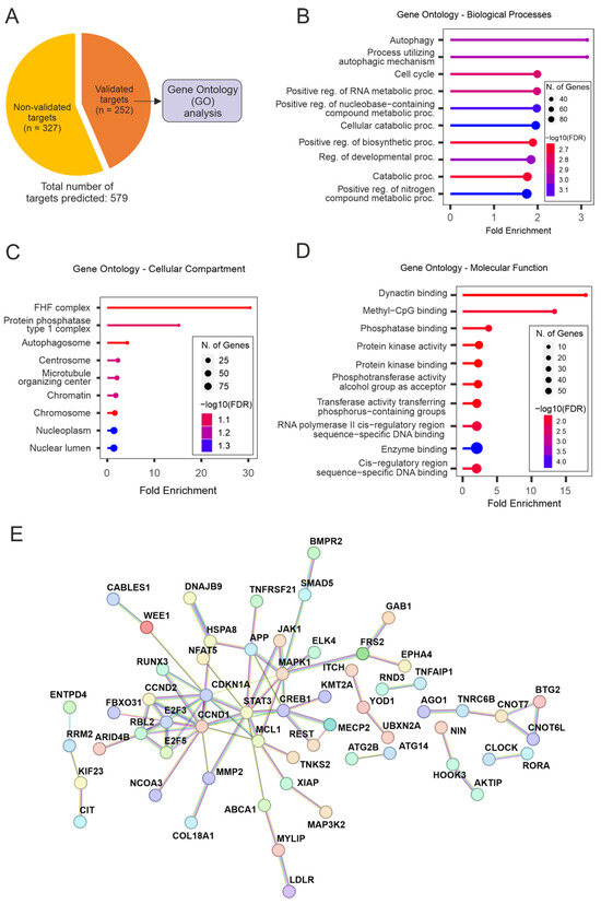 Enrichment analyses for the targets of hsa-miR-17-5p. (A) Target prediction results reveal a total of 579 predicted targets for hsa-miR-17-5p—of which 252 have been experimentally validated. The list of validated targets used for all enrichment analyses is presented here. (B–D) Gene ontology analyses for the targets of hsa-miR-17-5p. These analyses were divided into sub-categories: Biological Processes (B), Cellular Component (C), and Molecular Function (D). (E) Protein-protein interaction (PPI) networks for the targets of hsa-miR-17-5p that composed GO-BP enrichment results. STAT3, MAPK1, CREB1, E2F3/5, MCL1, CCND1/2, and CDKN1A appear as important molecular hubs.