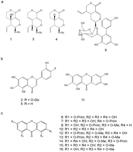- Jensen, S.R.; Schripsema, J. Chemotaxonomy and pharmacology of Gentianaceae. In Gentianaceae—Systematics and Natural History; Struwe, L., Albert, V., Eds.; Cambridge University Press: Cambridge, UK, 2002; pp. 573–631. [Google Scholar]
